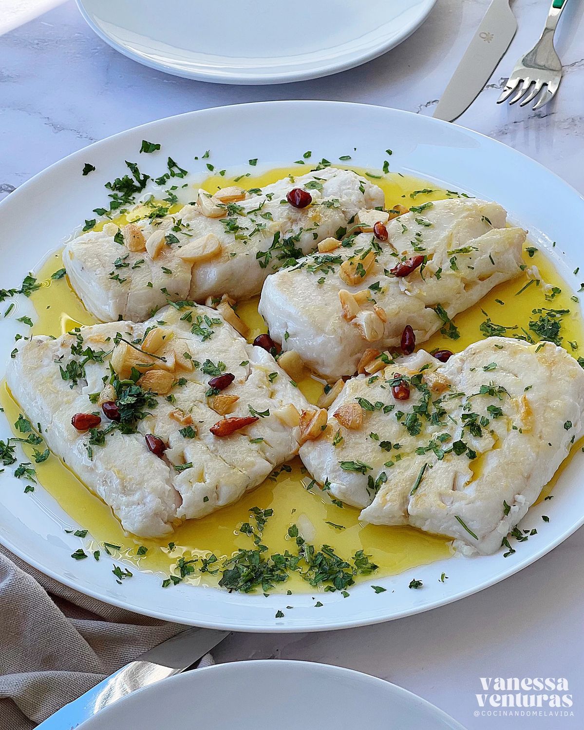 Merluza al Ajillo con Berenjena Asada